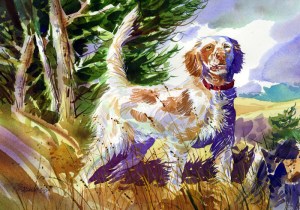 The painting of this English Setter (Rusty) in his field of dreams was done purely as an exercise on my part and not a commissioned portrait. It most assuredly is not for sale! Why? Because I used several source materials for reference while attempting to portray this regal bird dog on point ready for action. Early on, when I was drumming up business for my portrait work, I would use this demo as an example of the kind of projects I felt could be accomplished given the chance with my recent entry into the world of animal portraiture. I’m not a hunter but have always thought the setter breeds were truly magnificent looking dogs.
